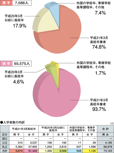 平成21年4月短期大学入学者のうち、同年3月に高校を卒業した学生(現役入学者)の占める割合は、男子74.8%、女子93.7%です。 |