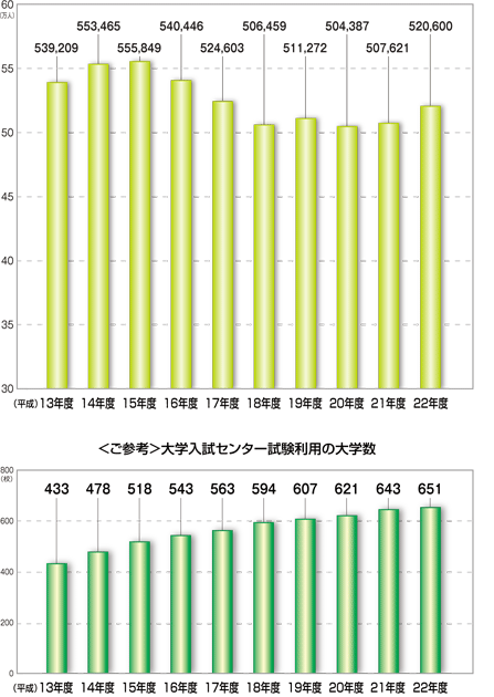 | データ資料: | 独立行政法人 大学入試センターのホームページより ※受験者数については、平成22年2月5日現在のものです。 センター試験利用の大学数については、平成21年10月31日現在のものです。 (22年度は予定数) |