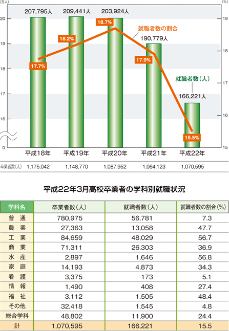 | データ資料: | 「平成22年3月高等学校卒業者の就職状況(平成22年3月末現在)に関する調査について」 <文部科学省初等中等教育局児童生徒課> |