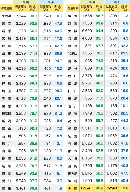 | 平成22年(2010年)3月高等学校卒業者(各都道府県就職者の内訳) |