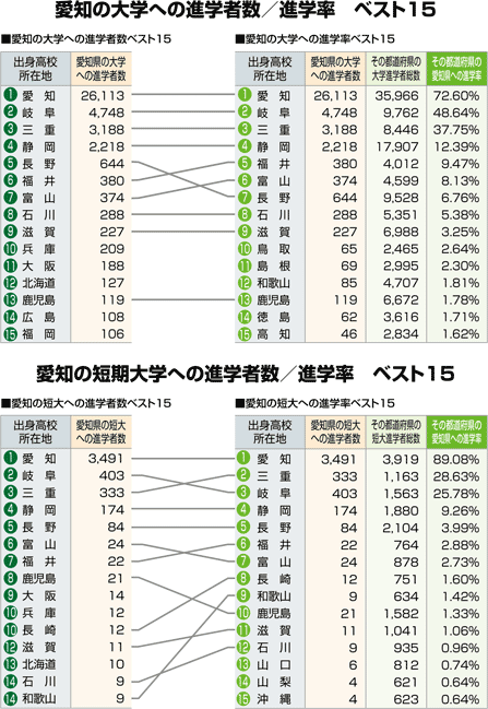 | 愛知への進学者数と「大学・短大進学者のうち何%が愛知に進学したか」という進学率の2つの視点から都道府県別にまとめました。 |