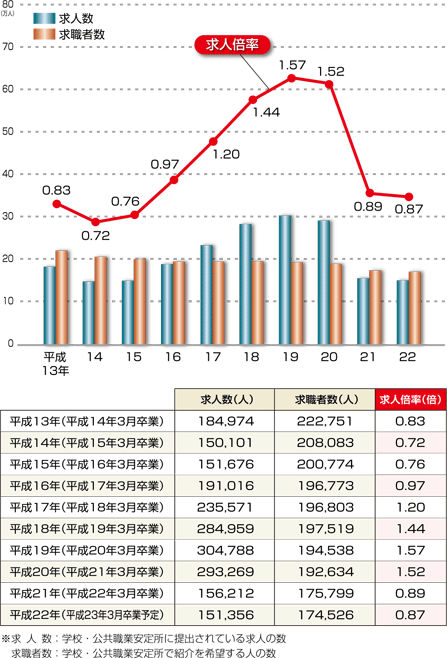 | データ資料: | 平成22年度高校・中学新卒者の就職内定状況等(平成22年9月末現在)について <厚生労働省> |