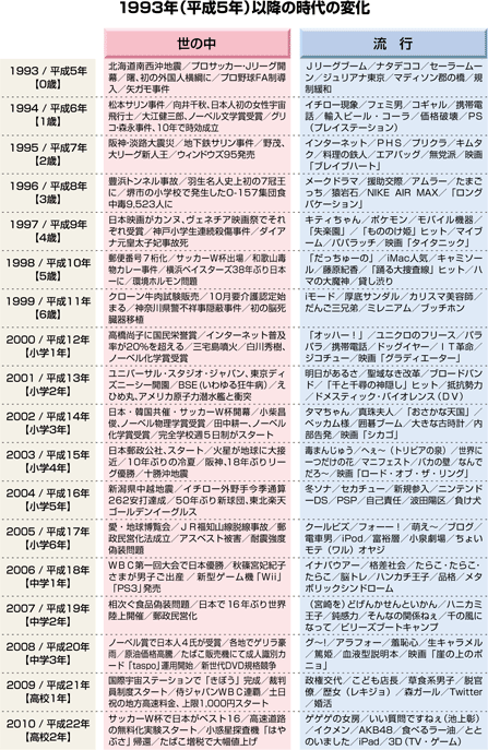 現在の高校3年生が生まれた年から、昨年までの「世の中」と「流行」をまとめました。彼らの人間像を理解するための一助としてご高覧いただければ幸いです。 |