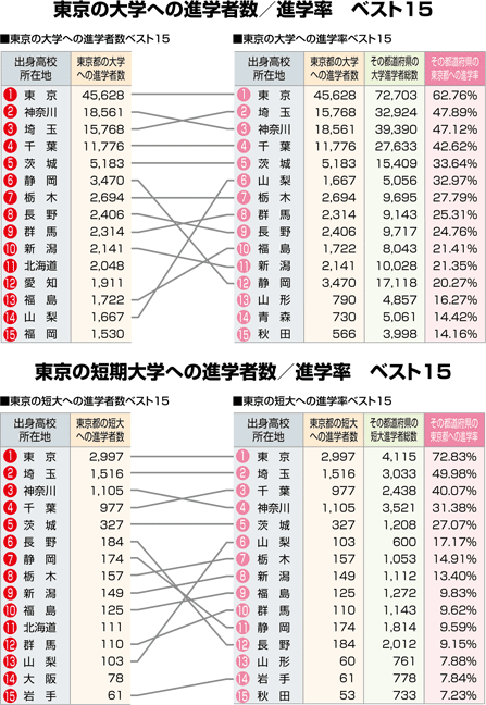 | 東京への進学者数と「大学・短大進学者のうち何%が東京に進学したか」という進学率の2つの視点から都道府県別にまとめました。 |