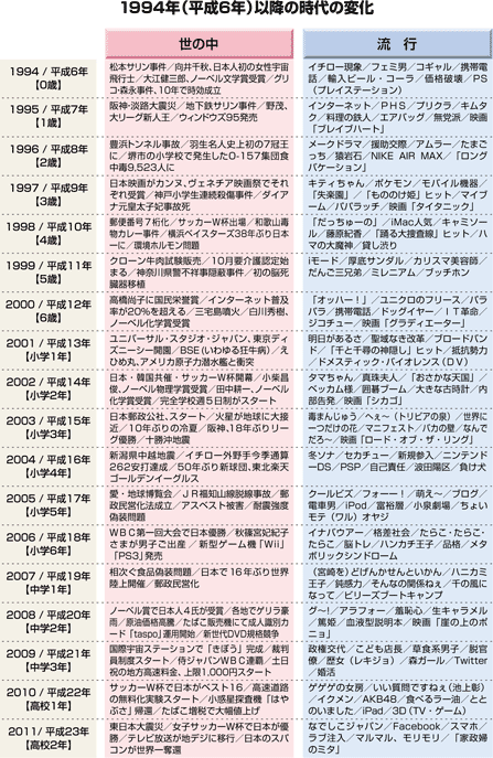 現在の高校3年生が生まれた年から、昨年までの「世の中」と「流行」をまとめました。彼らの人間像を理解するための一助としてご高覧いただければ幸いです。 |
