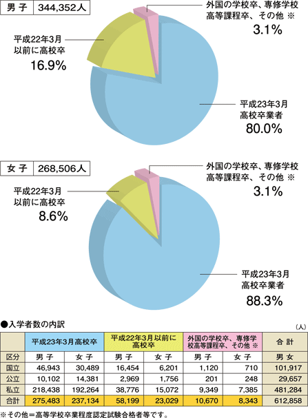 平成23年4月大学入学者のうち、同年3月に高校を卒業した学生(現役入学者)の占める割合は、男子80.0%、女子88.3%です。 |