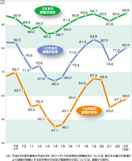 | 調査対象: | 各年度の高等学校卒業予定者で就職を希望した高校生 (平成23年10月末現在187,539人、平成23年12月末現在184,756人、 平成24年3月末現在184,148人) |