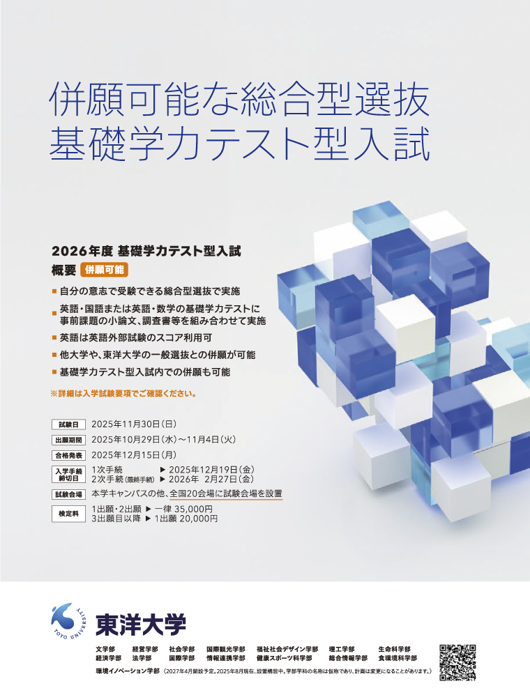 総合型選抜入試・学校推薦型選抜入試・一般選抜型入試(大学入学共通テスト利用入試、一般入試等)など、さまざまな入試制度を設けています。また、すべてインターネットからの出願となります。詳しくは、本学入試情報サイト「TOYO Web Style」でご確認ください。