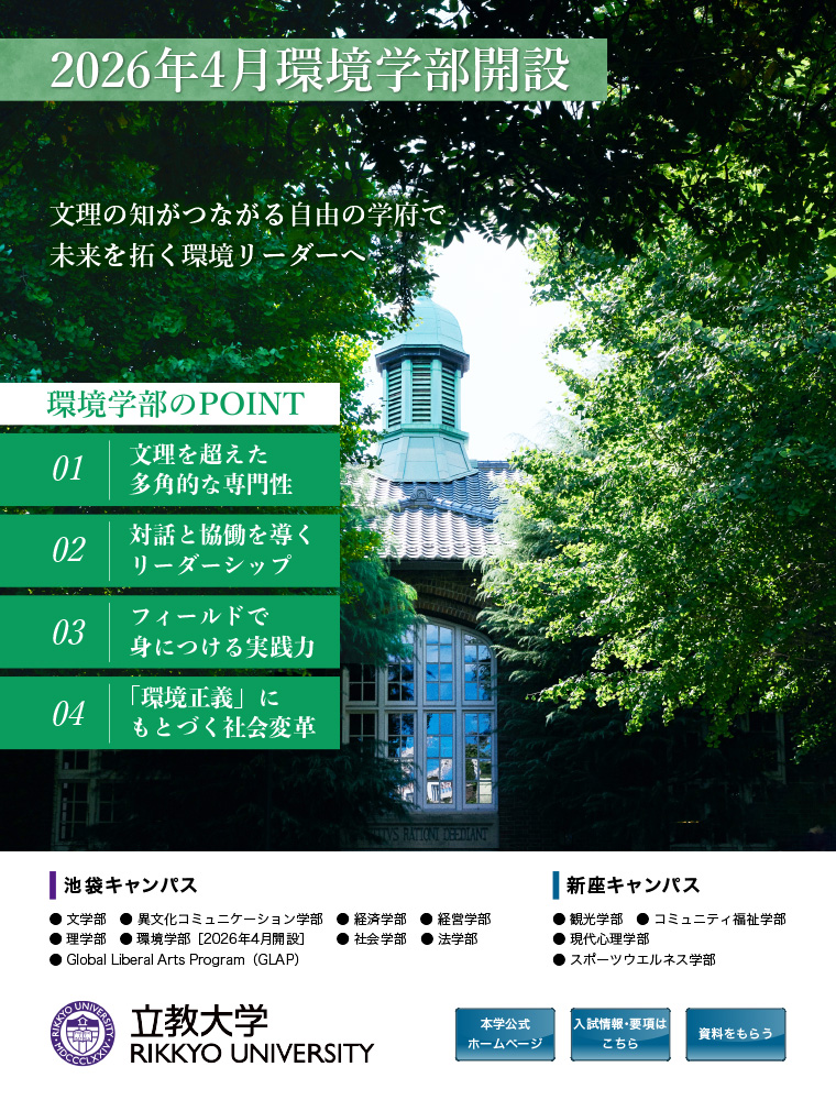 本学は1874年の開学以来、知性・感性・身体のバランスが取れた全人教育を意味する「リベラルアーツ」を教育理念としています。この理念を基にした「RIKKYO Learning Style」は、徹底した初年度教育「立教ファーストタームプログラム」やグローバル教養副専攻制度等により、世界に通用する教養人を育成します。