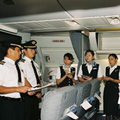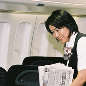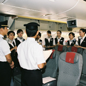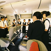 飛行機の中でお客さまが快適に過ごせるように、飲み物や食べ物を配ったり、安全を確かめたりする仕事です。