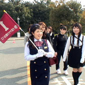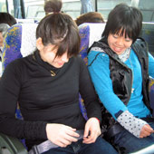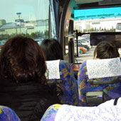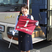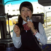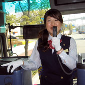 バスに乗って観光の案内をして、お客さまを楽しませます。バスが後ろに動いたり曲がる時には、安全を確かめて運転手を助けます。