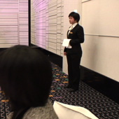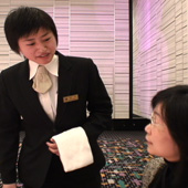 ホテルでの披露宴やパーティで料理などを運ぶ仕事です。参加した人が楽しく気持ちのよい時間を過ごせるようにサービスします。