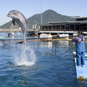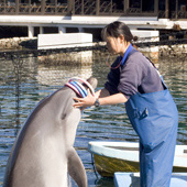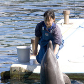 水族館などのショーで活躍するイルカの世話をし、芸を教える仕事です。ショーではイルカと一緒にお客さまを楽しませます。