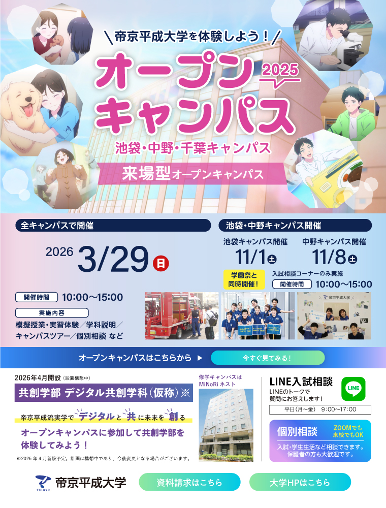 池袋・中野・千葉キャンパスで開催。詳細はオープンキャンパスページ及び本学HPをご確認ください。