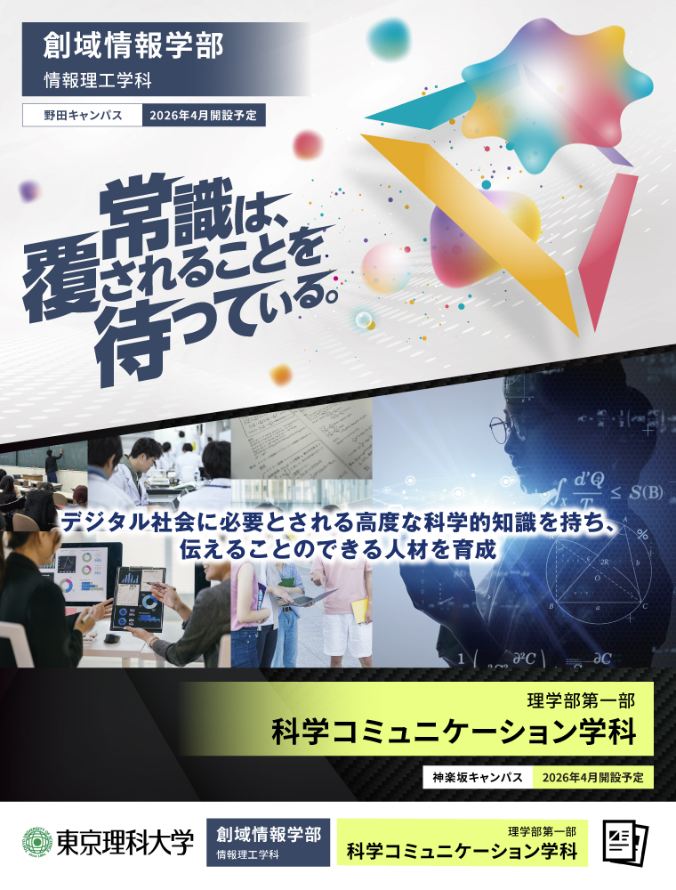 東京理科大学は、2031年に迎える創立150周年に向けて掲げた「世界の未来を拓くTUS」実現に向けた施策を進めております。今般、科学技術の発展に寄与し国際社会に貢献していくことを目的に、情報系分野を担う「デジタル人材」の育成を主眼とし、新たな時代に即した最先端の情報科学技術を担う人材の育成を目指す「創域情報学部」、並びに、情報化社会において、高度な科学技術を広く一般に伝える人材を輩出することを目指す理学部第一部「科学コミュニケーション学科」を、2026年4月に設置します。詳細は本学のホームページにてご確認ください。