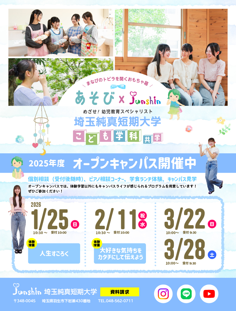 オープンキャンパス イベント一覧 すべて 来校型 オンライン型 随時 Webオーキャン 2/11(祝) 建国記念の日 オープンキャンパス 埼玉県羽生市下岩瀬430 友達・保護者OK ランチ付き 参加する 3/22(日) オープンキャンパス 埼玉県羽生市下岩瀬430 友達・保護者OK ランチ付き 参加する 3/28(土) オープンキャンパス 埼玉県羽生市下岩瀬430 友達・保護者OK ランチ付き 参加する 2/11(祝) 建国記念の日 オープンキャンパス 埼玉県羽生市下岩瀬430 友達・保護者OK ランチ付き 参加する 3/22(日) オープンキャンパス 埼玉県羽生市下岩瀬430 友達・保護者OK ランチ付き 参加する 3/28(土) オープンキャンパス 埼玉県羽生市下岩瀬430 友達・保護者OK ランチ付き 参加する 随時 Webオーキャン オープンキャンパスのチェックポイント Q. オープンキャンパスに行くメリットは? A. パンフレットやホームページではわからない学校の雰囲気や特徴を知ることができる。オープンキャンパスは、校舎や施設を見学し、説明を聞いたり、質 問したりすることで、学校の雰囲気や特徴を知ることができるイベントだ。興味のある学校にいくつか参加して比較しよう。 ①入学後の生活をイメージできる 学校の雰囲気が体感でき、また授業・実習を体験できるので、入学後のイメージができる。 ②疑問を解消できる 先生や在校生に、入試や授業、学生生活で気になることなどを直接質問ができる。 ③モチベーションがアップする キャンパスを見たり、授業などを体験することで受験や進学へのモチベーションがアップする。 ④入学後のミスマッチが防げる 入学後に「イメージと違った、こんなはずではなかった」と悔やまないように、入学前に学校への理解を深めることができる。 もっと見る Q. オープンキャンパスってどんなことをするの? A. キャンパス見学や体験授業、学校の説明や個別の相談会など、学校を知ることができる絶好のチャンス!オープンキャンパスは、各学校が独自に工夫を凝らしたものとなっ ている。また、友人と参加できるのはもちろん、保護者の方が同伴できるものも多く、保護者向けの説明会や相談会を同時に開催する学校も増えている。オープンキャンパスは、気になる学校をじっくりと観察できる絶好のチャンス。その主な内容を見ていこう。 ●キャンパス見学ツアー 教室、図書館、食堂、体育施設などさまざまな施設・設備を見学。在校生たちがガイド役となって、説明しながら案内してくれる場合が多い。 ●模擬授業・体験授業 講義や実習などを体験することができる。実際に行われている研究や学びの内容を知る大変よい機会となる。 ●学校説明会 学校全体の説明から、学部・学科・コースの内容説明、就職支援体制や就職実績、奨学金制度の紹介などが行われる。保護者向けの説明会を設けている学校もある。 ●入試説明会 一見複雑な入試方式の特徴やポイントを解説してくれる。入試対策のアドバイスが聞けたり、入試対策講座を実施する学校もあるようだ。 ●個別相談会 学校の担当者に、入試、奨学金、就職支援などの疑問を個別に相談ができる。また保護者向けに個別相談の時間を設けている学校もある。 ●その他 オープンキャンパスの参加が、総合型選抜(AO入試)のエントリーを兼ねていたり、オープンキャンパス会場でエントリー受付を行っていたりする学校もある。 ■タイムスケジュール例1 9:30~ 10:00~ 10:30~ 11:10~ 12:20~ 本人 受付開始 学校説明会 模擬授業 キャンパスツアー 昼食 保護者 受付開始 保護者説明会 模擬授業 保護者相談会 昼食 ■タイムスケジュール例2 9:00~ 10:00~ 10:50~ 12:20~ スクールバス送迎 説明会 キャンパスツアー・ミニ体験授業 座談会形式「先輩と話そう」 ←―――保護者相談・個別相談(希望者)――――→ もっと見る Q. オープンキャンパスに行くための事前準備は? A. 参加予約などでスケジュールを決め、パンフレットを取り寄せて学校のことを事前に調べよう! いきなりオープンキャンパス当日に学校に行って、予約が必要だった、定員が一杯だっ た…など参加できないということにならないように、参加したい学校のオープンキャンパスに事前予約が必要かを調べ、予約できる場合は予約をしておくとあわてることがないだろう。 また、たくさんの学部や学科・コースがある学校では、さまざまなプログラムを用意しているケースが多い。知りたいことや体験してみたいことを整理し、当日参加したいプログラムを決めておくと、より効率がよいだろう。 オープンキャンパスでは、先生や在校生などに質問することも可能だ。そのために、学校のパンフレットを取り寄せて、学校のことや、興味のある学部・学科・コースのことをあらかじめ調べておき、気になった点や疑問点などは手帳やノートにメモしておいて、チャンスがあれば当日確認しよう。 もっと見る Q. オープンキャンパスに参加するときの服装は? A. 学校の担当者に不快感を与えるような服装は避ければ私服でもOKです!制服でも構い