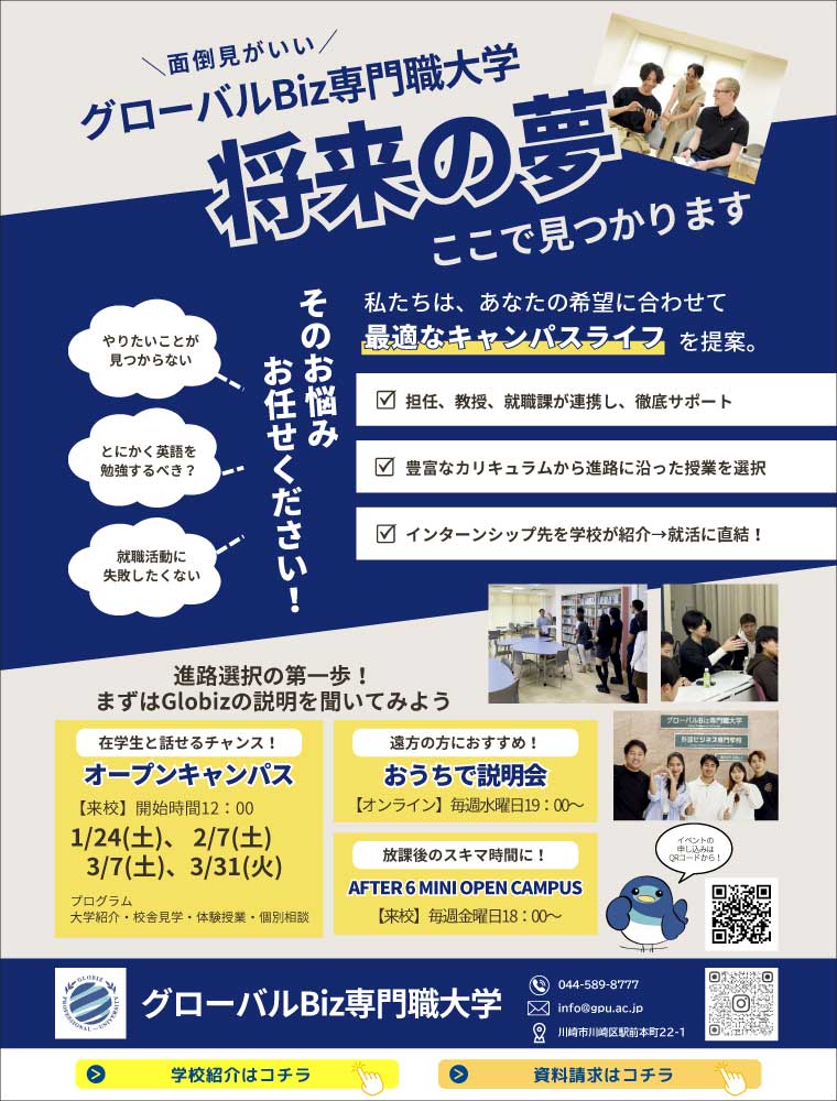 オープンキャンパス イベント一覧 すべて 来校型 オンライン型 2/4(水) 19:00~20:00 おうちで説明会(ONLINE BRIEFING) 参加する 2/6(金) 18:00~19:00 アフター6ミニオープンキャンパス 神奈川県川崎市川崎区駅前本町22-1 友達・保護者OK 奨学金制度の紹介 参加する 2/7(土) 12:00~14:00 学校説明会 神奈川県川崎市川崎区駅前本町22-1 友達・保護者OK 参加する 2/18(水) 19:00~20:00 おうちで説明会(ONLINE BRIEFING) 参加する 2/20(金) 18:00~19:00 アフター6ミニオープンキャンパス 神奈川県川崎市川崎区駅前本町22-1 友達・保護者OK 奨学金制度の紹介 参加する 2/25(水) 19:00~20:00 おうちで説明会(ONLINE BRIEFING) 参加する 2/27(金) 18:00~19:00 アフター6ミニオープンキャンパス 神奈川県川崎市川崎区駅前本町22-1 友達・保護者OK 奨学金制度の紹介 参加する 3/4(水) 19:00~20:00 おうちで説明会(ONLINE BRIEFING) 参加する 3/6(金) 18:00~19:00 アフター6ミニオープンキャンパス 神奈川県川崎市川崎区駅前本町22-1 友達・保護者OK 奨学金制度の紹介 参加する 3/7(土) 12:00~14:00 学校説明会 神奈川県川崎市川崎区駅前本町22-1 友達・保護者OK 参加する 3/11(水) 19:00~20:00 おうちで説明会(ONLINE BRIEFING) 参加する 3/18(水) 19:00~20:00 おうちで説明会(ONLINE BRIEFING) 参加する 3/31(火) 12:00~14:00 学校説明会 神奈川県川崎市川崎区駅前本町22-1 友達・保護者OK 参加する もっと見る 2/6(金) 18:00~19:00 アフター6ミニオープンキャンパス 神奈川県川崎市川崎区駅前本町22-1 友達・保護者OK 奨学金制度の紹介 参加する 2/7(土) 12:00~14:00 学校説明会 神奈川県川崎市川崎区駅前本町22-1 友達・保護者OK 参加する 2/20(金) 18:00~19:00 アフター6ミニオープンキャンパス 神奈川県川崎市川崎区駅前本町22-1 友達・保護者OK 奨学金制度の紹介 参加する 2/27(金) 18:00~19:00 アフター6ミニオープンキャンパス 神奈川県川崎市川崎区駅前本町22-1 友達・保護者OK 奨学金制度の紹介 参加する 3/6(金) 18:00~19:00 アフター6ミニオープンキャンパス 神奈川県川崎市川崎区駅前本町22-1 友達・保護者OK 奨学金制度の紹介 参加する 3/7(土) 12:00~14:00 学校説明会 神奈川県川崎市川崎区駅前本町22-1 友達・保護者OK 参加する 3/31(火) 12:00~14:00 学校説明会 神奈川県川崎市川崎区駅前本町22-1 友達・保護者OK 参加する 2/4(水) 19:00~20:00 おうちで説明会(ONLINE BRIEFING) 参加する 2/18(水) 19:00~20:00 おうちで説明会(ONLINE BRIEFING) 参加する 2/25(水) 19:00~20:00 おうちで説明会(ONLINE BRIEFING) 参加する 3/4(水) 19:00~20:00 おうちで説明会(ONLINE BRIEFING) 参加する 3/11(水) 19:00~20:00 おうちで説明会(ONLINE BRIEFING) 参加する 3/18(水) 19:00~20:00 おうちで説明会(ONLINE BRIEFING) 参加する オープンキャンパスのチェックポイント Q. オープンキャンパスに行くメリットは? A. パンフレットやホームページではわからない学校の雰囲気や特徴を知ることができる。オープンキャンパスは、校舎や施設を見学し、説明を聞いたり、質 問したりすることで、学校の雰囲気や特徴を知ることができるイベントだ。興味のある学校にいくつか参加して比較しよう。 ①入学後の生活をイメージできる 学校の雰囲気が体感でき、また授業・実習を体験できるので、入学後のイメージができる。 ②疑問を解消できる 先生や在校生に、入試や授業、学生生活で気になることなどを直接質問ができる。 ③モチベーションがアップする キャンパスを見たり、授業などを体験することで受験や進学へのモチベーションがアップする。 ④入学後のミスマッチが防げる 入学後に「イメージと違った、こんなはずではなかった」と悔やまないように、入学前に学校への理解を深めることができる。 もっと見る Q. オープンキャンパスってどんなことをするの? A. キャンパス見学や体験授業、学校の説明や個別の相談会など、学校を知ることができる絶好のチャンス!オープンキャンパスは、各学校が独自に工夫を凝らしたものとなっ ている。また、友人と参加できるのはもちろん、保護者の方が同伴できるものも多く、保護者向けの説明会や相談会を同時に開催する学校も増えている。オープンキャンパスは、気になる学校をじっくりと観察できる絶好のチャンス。その主な内容を見ていこう。 ●キャンパス見学ツアー 教室、図書館、食堂、体育施設などさまざまな施設・設備を見学。在校生たちがガイド役となって、説明しながら案内してくれる場合が多い。 ●模擬授業・体験授業 講義や実習などを体験することができる。実際に行われている研究や学びの内容を知る大変よい機会となる。 ●学校説明会 学校全体の説明から、学部・学科・コースの内容説明、就職支援体制や就職実績、奨学金制度の紹介などが行われる。保護者向けの説明会を設けている学校もある。 ●入試説明会 一見複雑な入試方式の特徴やポイントを解説してくれる。入試対策のアドバイスが聞けたり、入試対策講座を実施する学校もあるようだ。 ●個別相談会 学校の担当者に、入試、奨学金、就職支援などの疑問を個別に相談ができる。また保護者向けに個別相談の時間を設けている学校も
