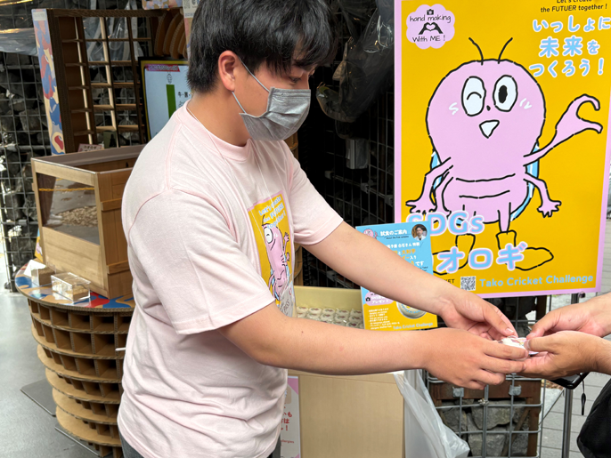 また、多古町の和菓子店の協力で製造したコオロギパウダー入りのまんじゅうを配布。当プロジェクトの意義を聞いてから受け取る来場者が多く、部員たちは「万博で紹介する機会をもらえてよかった」と感謝。食用コオロギの研究を深めるとともに、未来を担う子どもへのSDGs学習や、食利用以外の新たな産業創出の可能性も見つけていきたいと話していた。