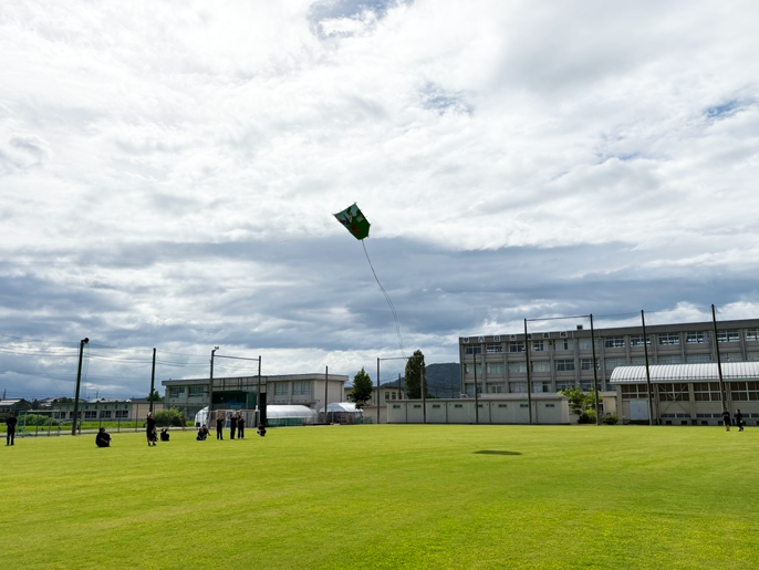 春から製作に取り掛かり完成した「復興支援2畳凧」。7月18日の終業式後、同校グラウンドで部員たちにひかれ、南風に乗って空高く飛翔した。