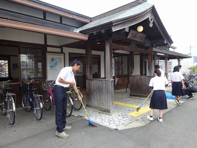 2012年から実施しているのが、生徒の大半が通学に利用するJR飯田線の無人駅「三河一宮駅」の清掃活動。1897年開業の同駅は、三河国一宮の砥鹿(とが)神社参拝の下車駅で、1990年、同神社の本殿をイメージした駅舎に改修された。