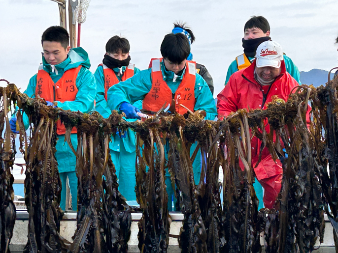 その一つが、中学部の生徒を対象にした大槌町特産のワカメ漁の体験授業。東日本大震災で養殖場が荒れた影響で、6年間中断したが、2017年2月に復活。生徒たちはワカメに関する事前学習を受けたのち、地元漁業関係者の支援を受け、吉里吉里漁港から漁船で養殖場に向かい、ワカメの刈り取り作業を実施。帰港後は集荷場で保護者と収穫したワカメを湯通しし、塩蔵作業を行った。さらに芯裂きや選別、袋詰めなどの一連の作業も生徒たちで取り組んだ。