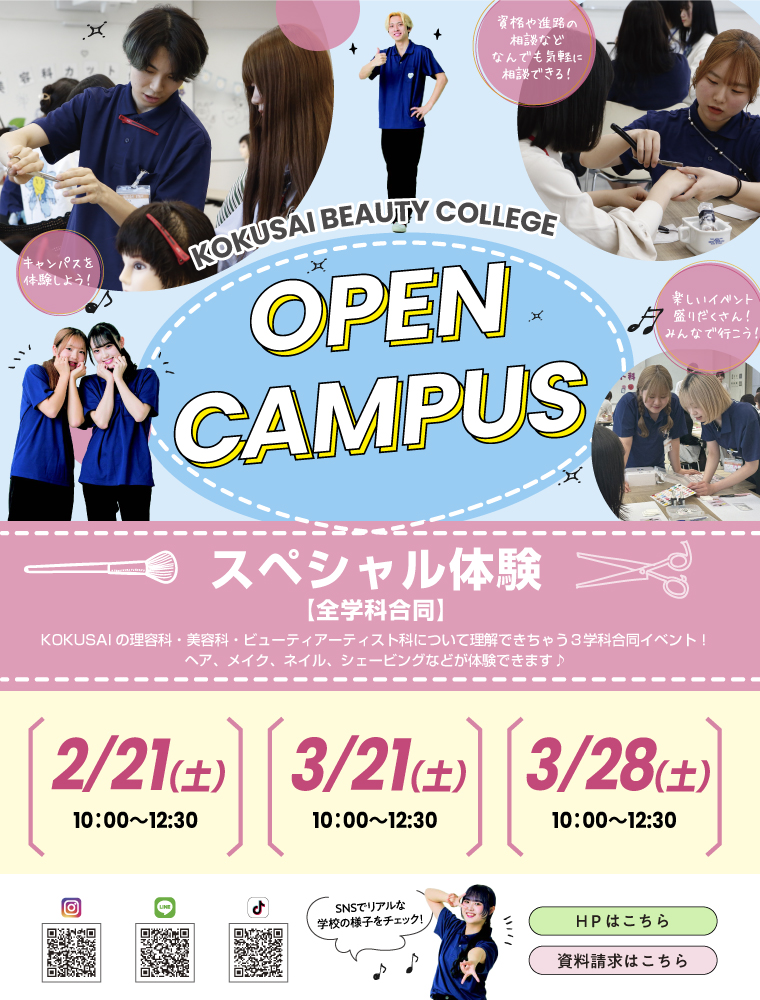 オープンキャンパス イベント一覧 すべて 来校型 オンライン型 随時 オンライン説明会×YouTube 随時 オンライン個別相談×Google Meet 2/21(土) 10:00~12:30 【全学科合同】スペシャル体験 東京都荒川区東日暮里5-17-8 友達・保護者OK 奨学金制度の紹介 交通費補助 教育費無償化の紹介 個別相談可能 フリーター・大学生歓迎 参加する 3/21(土) 10:00~12:30 【全学科合同】スペシャル体験 東京都荒川区東日暮里5-17-8 友達・保護者OK 奨学金制度の紹介 交通費補助 教育費無償化の紹介 個別相談可能 フリーター・大学生歓迎 参加する 3/28(土) 10:00~12:30 【全学科合同】スペシャル体験 東京都荒川区東日暮里5-17-8 友達・保護者OK 奨学金制度の紹介 交通費補助 教育費無償化の紹介 個別相談可能 フリーター・大学生歓迎 参加する 2/21(土) 10:00~12:30 【全学科合同】スペシャル体験 東京都荒川区東日暮里5-17-8 友達・保護者OK 奨学金制度の紹介 交通費補助 教育費無償化の紹介 個別相談可能 フリーター・大学生歓迎 参加する 3/21(土) 10:00~12:30 【全学科合同】スペシャル体験 東京都荒川区東日暮里5-17-8 友達・保護者OK 奨学金制度の紹介 交通費補助 教育費無償化の紹介 個別相談可能 フリーター・大学生歓迎 参加する 3/28(土) 10:00~12:30 【全学科合同】スペシャル体験 東京都荒川区東日暮里5-17-8 友達・保護者OK 奨学金制度の紹介 交通費補助 教育費無償化の紹介 個別相談可能 フリーター・大学生歓迎 参加する 随時 オンライン説明会×YouTube 随時 オンライン個別相談×Google Meet オープンキャンパスのチェックポイント Q. オープンキャンパスに行くメリットは? A. パンフレットやホームページではわからない学校の雰囲気や特徴を知ることができる。オープンキャンパスは、校舎や施設を見学し、説明を聞いたり、質 問したりすることで、学校の雰囲気や特徴を知ることができるイベントだ。興味のある学校にいくつか参加して比較しよう。 ①入学後の生活をイメージできる 学校の雰囲気が体感でき、また授業・実習を体験できるので、入学後のイメージができる。 ②疑問を解消できる 先生や在校生に、入試や授業、学生生活で気になることなどを直接質問ができる。 ③モチベーションがアップする キャンパスを見たり、授業などを体験することで受験や進学へのモチベーションがアップする。 ④入学後のミスマッチが防げる 入学後に「イメージと違った、こんなはずではなかった」と悔やまないように、入学前に学校への理解を深めることができる。 もっと見る Q. オープンキャンパスってどんなことをするの? A. キャンパス見学や体験授業、学校の説明や個別の相談会など、学校を知ることができる絶好のチャンス!オープンキャンパスは、各学校が独自に工夫を凝らしたものとなっ ている。また、友人と参加できるのはもちろん、保護者の方が同伴できるものも多く、保護者向けの説明会や相談会を同時に開催する学校も増えている。オープンキャンパスは、気になる学校をじっくりと観察できる絶好のチャンス。その主な内容を見ていこう。 ●キャンパス見学ツアー 教室、図書館、食堂、体育施設などさまざまな施設・設備を見学。在校生たちがガイド役となって、説明しながら案内してくれる場合が多い。 ●模擬授業・体験授業 講義や実習などを体験することができる。実際に行われている研究や学びの内容を知る大変よい機会となる。 ●学校説明会 学校全体の説明から、学部・学科・コースの内容説明、就職支援体制や就職実績、奨学金制度の紹介などが行われる。保護者向けの説明会を設けている学校もある。 ●入試説明会 一見複雑な入試方式の特徴やポイントを解説してくれる。入試対策のアドバイスが聞けたり、入試対策講座を実施する学校もあるようだ。 ●個別相談会 学校の担当者に、入試、奨学金、就職支援などの疑問を個別に相談ができる。また保護者向けに個別相談の時間を設けている学校もある。 ●その他 オープンキャンパスの参加が、総合型選抜(AO入試)のエントリーを兼ねていたり、オープンキャンパス会場でエントリー受付を行っていたりする学校もある。 ■タイムスケジュール例1 9:30~ 10:00~ 10:30~ 11:10~ 12:20~ 本人 受付開始 学校説明会 模擬授業 キャンパスツアー 昼食 保護者 受付開始 保護者説明会 模擬授業 保護者相談会 昼食 ■タイムスケジュール例2 9:00~ 10:00~ 10:50~ 12:20~ スクールバス送迎 説明会 キャンパスツアー・ミニ体験授業 座談会形式「先輩と話そう」 ←―――保護者相談・個別相談(希望者)――――→ もっと見る Q. オープンキャンパスに行くための事前準備は? A. 参加予約などでスケジュールを決め、パンフレットを取り寄せて学校のことを事前に調べよう! いきなりオープンキャンパス当日に学校に行って、予約が必要だった、定員が一杯だっ た…など参加できないということにならないように、参加したい学校のオープンキャンパスに事前予約が必要かを調べ、予約できる場合は予約をしておくとあわてることが