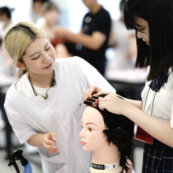 2年次の選択授業の中には、ヘアスタイリスト、ヘアメイクアップアーティスト、またはブライダルヘアメイクとして活躍されている先生方による授業があります。現場での経験に即した技術やトレンドを学びます。