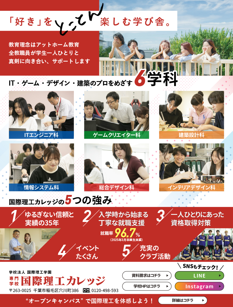 オープンキャンパス イベント一覧 すべて 来校型 オンライン型 3/28(土) 09:30~15:00 学校体験会 千葉県千葉市稲毛区穴川町386 友達・保護者OK ランチ付き 保護者のみOK 個別相談可能 参加する 4/25(土) 09:30~12:30 学校説明会 千葉県千葉市稲毛区穴川町386 友達・保護者OK 奨学金制度の紹介 入学に有利 教育費無償化の紹介 保護者のみOK 個別相談可能 フリーター・大学生歓迎 参加する 5/10(日) 09:30~12:30 学校説明会 千葉県千葉市稲毛区穴川町386 友達・保護者OK 奨学金制度の紹介 入学に有利 教育費無償化の紹介 保護者のみOK 個別相談可能 フリーター・大学生歓迎 参加する 5/16(土) 09:30~12:30 学校説明会 千葉県千葉市稲毛区穴川町386 友達・保護者OK 奨学金制度の紹介 入学に有利 教育費無償化の紹介 保護者のみOK 個別相談可能 フリーター・大学生歓迎 参加する 5/23(土) 09:30~12:30 学校説明会 千葉県千葉市稲毛区穴川町386 友達・保護者OK 奨学金制度の紹介 入学に有利 教育費無償化の紹介 保護者のみOK 個別相談可能 フリーター・大学生歓迎 参加する 5/31(日) 09:30~15:00 学校体験会 千葉県千葉市稲毛区穴川町386 友達・保護者OK ランチ付き 保護者のみOK 個別相談可能 参加する 6/6(土) 09:30~12:30 学校説明会 千葉県千葉市稲毛区穴川町386 友達・保護者OK 奨学金制度の紹介 入学に有利 教育費無償化の紹介 保護者のみOK 個別相談可能 フリーター・大学生歓迎 参加する 6/14(日) 09:30~12:30 学校説明会 千葉県千葉市稲毛区穴川町386 友達・保護者OK 奨学金制度の紹介 入学に有利 教育費無償化の紹介 保護者のみOK 個別相談可能 フリーター・大学生歓迎 参加する 6/20(土) 09:30~12:30 学校説明会 千葉県千葉市稲毛区穴川町386 友達・保護者OK 奨学金制度の紹介 入学に有利 教育費無償化の紹介 保護者のみOK 個別相談可能 フリーター・大学生歓迎 参加する 6/28(日) 09:30~15:00 学校体験会 千葉県千葉市稲毛区穴川町386 友達・保護者OK ランチ付き 保護者のみOK 個別相談可能 参加する 7/11(土) 09:30~12:30 学校説明会 千葉県千葉市稲毛区穴川町386 友達・保護者OK 奨学金制度の紹介 入学に有利 教育費無償化の紹介 保護者のみOK 個別相談可能 フリーター・大学生歓迎 参加する 7/18(土) 09:30~12:30 学校説明会 千葉県千葉市稲毛区穴川町386 友達・保護者OK 奨学金制度の紹介 入学に有利 教育費無償化の紹介 保護者のみOK 個別相談可能 フリーター・大学生歓迎 参加する 7/26(日) 09:30~15:00 学校体験会 千葉県千葉市稲毛区穴川町386 友達・保護者OK ランチ付き 保護者のみOK 個別相談可能 参加する 8/6(木) 09:30~12:30 学校説明会 千葉県千葉市稲毛区穴川町386 友達・保護者OK 奨学金制度の紹介 入学に有利 教育費無償化の紹介 保護者のみOK 個別相談可能 フリーター・大学生歓迎 参加する 8/19(水) 09:30~12:30 学校説明会 千葉県千葉市稲毛区穴川町386 友達・保護者OK 奨学金制度の紹介 入学に有利 教育費無償化の紹介 保護者のみOK 個別相談可能 フリーター・大学生歓迎 参加する 8/29(土) 09:30~15:00 学校体験会 千葉県千葉市稲毛区穴川町386 友達・保護者OK ランチ付き 保護者のみOK 個別相談可能 参加する 9/12(土) 09:30~12:30 学校説明会 千葉県千葉市稲毛区穴川町386 友達・保護者OK 奨学金制度の紹介 入学に有利 教育費無償化の紹介 保護者のみOK 個別相談可能 フリーター・大学生歓迎 参加する 9/26(土) 09:30~12:30 学校説明会 千葉県千葉市稲毛区穴川町386 友達・保護者OK 奨学金制度の紹介 入学に有利 教育費無償化の紹介 保護者のみOK 個別相談可能 フリーター・大学生歓迎 参加する 10/10(土) 09:30~12:30 学校説明会 千葉県千葉市稲毛区穴川町386 友達・保護者OK 奨学金制度の紹介 入学に有利 教育費無償化の紹介 保護者のみOK 個別相談可能 フリーター・大学生歓迎 参加する 11/7(土) 09:30~12:30 学校説明会 千葉県千葉市稲毛区穴川町386 友達・保護者OK 奨学金制度の紹介 入学に有利 教育費無償化の紹介 保護者のみOK 個別相談可能 フリーター・大学生歓迎 参加する 12/5(土) 09:30~12:30 学校説明会 千葉県千葉市稲毛区穴川町386 友達・保護者OK 奨学金制度の紹介 入学に有利 教育費無償化の紹介 保護者のみOK 個別相談可能 フリーター・大学生歓迎 参加する 1/23(土) 09:30~12:30 学校説明会 千葉県千葉市稲毛区穴川町386 友達・保護者OK 奨学金制度の紹介 入学に有利 教育費無償化の紹介 保護者のみOK 個別相談可能 フリーター・大学生歓迎 参加する 2/20(土) 09:30~12:30 学校説明会 千葉県千葉市稲毛区穴川町386 友達・保護者OK 奨学金制度の紹介 入学に有利 教育費無償化の紹介 保護者のみOK 個別相談可能 フリーター・大学生歓迎 参加する 3/10(水) 09:30~12:30 学校説明会 千葉県千葉市稲毛区穴川町386 友達・保護者OK 奨学金制度の紹介 入学に有利 教育費無償化の紹介 保護者のみOK 個別相談可能 フリーター・大学生歓迎 参加する もっと見る 3/28(土) 09:30~15:00 学校体験会 千葉県千葉市稲毛区穴川町386 友達・保護者OK ランチ付き 保護者のみOK 個別相談可能 参加する 4/25(土) 09:30~12:30 学校説明会 千葉県千葉市稲毛区穴川町386 友達・保護者OK 奨学金制度の紹